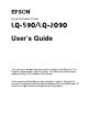 Introduction This manual covers the following basic information to get you started using your Epson® printer: ❏ Setting Up the Printer ❏ Paper Handling ❏ Using the Control Panel ❏ Troubleshooting ❏ Product Information Although most of the illustrations in this manual show the LQ-590, the instructions apply to both the LQ-590 and the LQ-2090. w Warnings must be followed carefully to avoid bodily injury. c Cautions must be observed to prevent damaging your equipment.