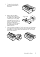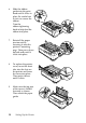 Light status Beep Problem pattern Solution F Pause — The print head is overheated. Wait a few minutes; the printer resumes printing automatically once the print head cools. F F F F F Paper Out Pause F Tear Off/Bin F F Font light F F Pitch light ••••• An unknown or serious printer error has occurred. Turn off the printer and leave it off for several minutes; then turn on the printer again. O = On, F = Flashing ••• = Three beeps, ••••• = Five beeps Clearing Paper Jams 1.
