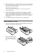 10. Attach the front cover with the continuous paper positioned as shown. 11. Make sure the paper guide is lying flat on the printer and slide the edge guides to the middle of the paper guide. 12. Turn on the printer. When the printer receives data, it automatically loads the paper and starts printing. If the first line on your page appears too high or low, you can change its position using the Micro Adjust function as described on page 33.