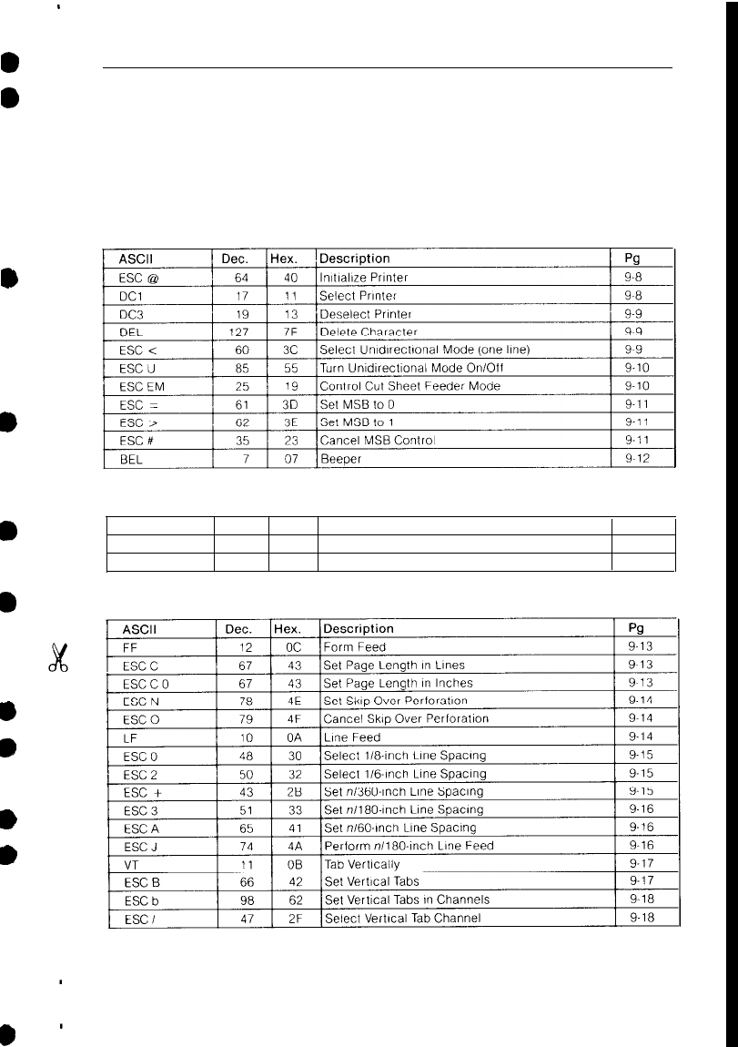 The following control codes are listed briefly for quick reference. For a more detailed