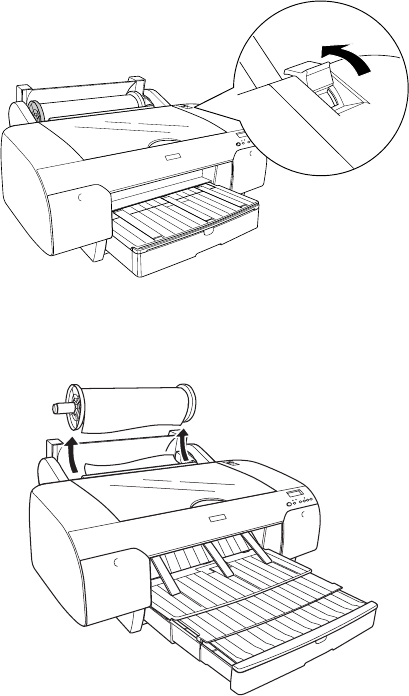 2. Open the roll paper cover, and move the paper lever to the released