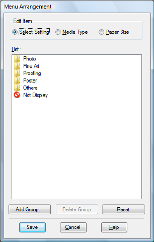 Use this utility to arrange the Select Setting, Media Type, and Paper Size