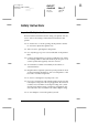 L R4C477 short.bk Rev_C A5 size 12/21/99 SAFE.FM Pass 2 Proof Sign-off: M.Otsuka, CRE Tsukada_______ N. Nomoto _______ _______ ❏ Unplug the printer and refer servicing to qualified service personnel under the following conditions: The power cord or plug is damaged; liquid has entered the printer; the printer has been dropped or the cabinet damaged; the printer does not operate normally or exhibits a distinct change in performance.