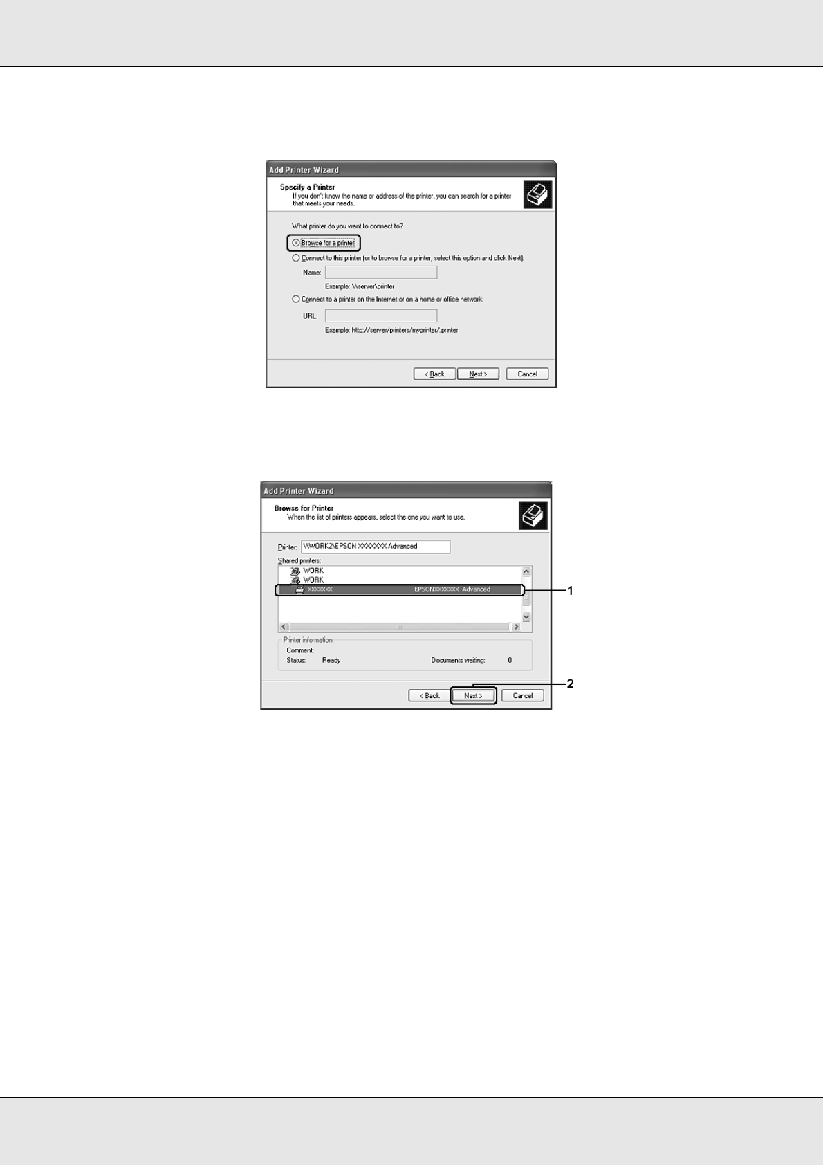 For Windows XP or XP x64, select Browse for a printer.