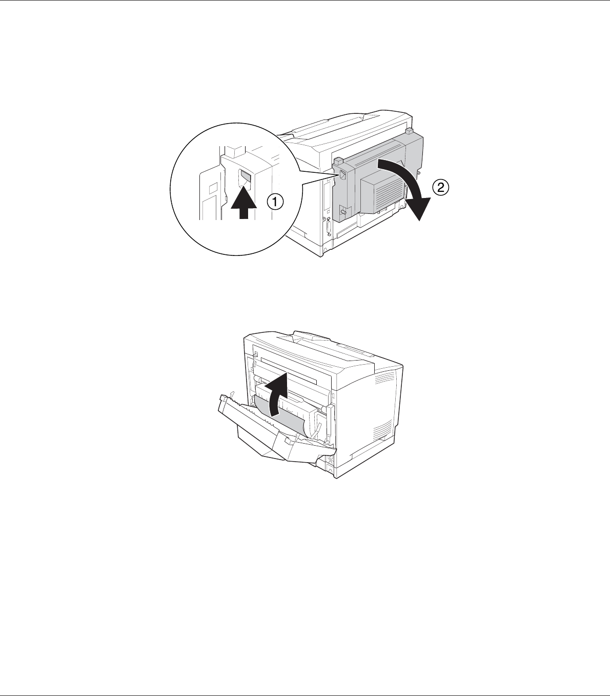 1. Press the unlock button to unlock the hooks. Then open the Duplex Unit’s cover.