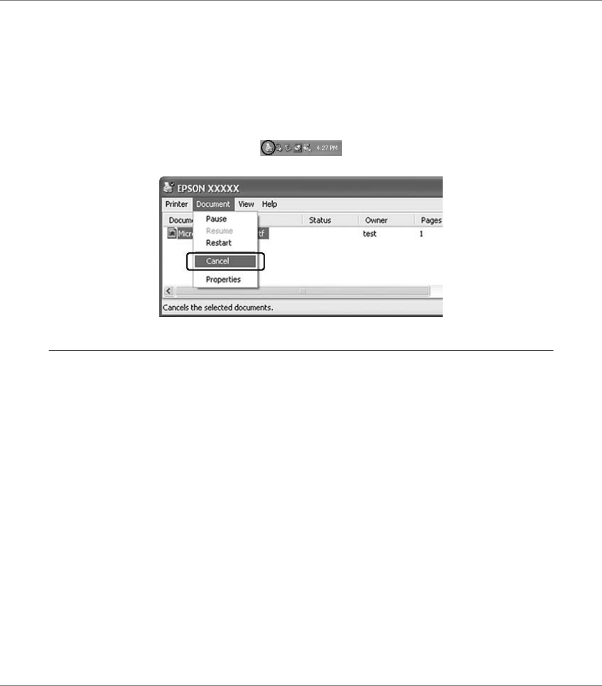 Double-click your printer’s icon on the taskbar. Select the job in the list, then click Cancel from the