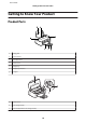 User’s Guide Maintaining Your Product and Software B Open the printer cover and make sure the ink cartridge holder is in the home position on the right. Note: If the ink cartridge holder is not in the home position on the right, turn on the product and wait until the ink cartridge holder locks in the far right position. Then turn off the product. C Secure the ink cartridge holder to the case with tape as shown, then close the printer cover.