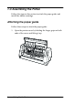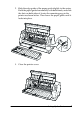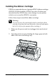Installing the Ribbon Cartridge EPSON recommends the use of genuine EPSON ribbon cartridges (S015139/S015066 for black, S015067 for color). Products not manufactured by EPSON may cause damage to your printer, which is not covered by EPSON’s warranties. Follow these steps to install the ribbon cartridge: w Warning: You need to move the print head by hand to install the ribbon cartridge. If you have just used the printer, the print head may be hot; let it cool for a few minutes before touching it. 1.