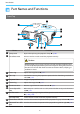 Introduction Part Names and Functions Front/Top Name a Lamp cover b Air exhaust vent Function Open when replacing the projector's lamp. s p.106 Exhaust vent for air used to cool the projector internally. Caution While projecting, do not put your face or hands near the air exhaust vent, and do not place objects that may become warped or damaged by heat near the vent. Hot air from the air exhaust vent could cause burns, warping, or accidents to occur. c Focus ring d Lens cap Adjusts the image focus.