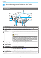 Einleitung Bezeichnung Funktion i Bedienfeld Bedienfeld des Projektors. Öffnen Sie die Bedienfeldabdeckung, um das Gerät zu bedienen. s S.9 j Fokusring k Zoomring Stellt den Bildfokus ein. s S.28 Stellt die Bildgröße ein. s S.28 Bedienfeld Tasten/Anzeigen Funktion a Blinkt bei laufender Aufwärm- oder Abkühlphase. Zeigt den Projektorstatus anhand einer Kombination mit anderen leuchtenden oder blinkenden Anzei‐ gen. s S.81 b Leuchtet orange, wenn die Lampe ausgewechselt werden sollte.