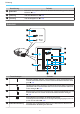 Einleitung Bezeichnung Funktion i Bedienfeld Bedienfeld des Projektors. Öffnen Sie die Bedienfeldabdeckung, um das Gerät zu bedienen. s S.9 j Fokusring k Zoomring Stellt den Bildfokus ein. s S.28 Stellt die Bildgröße ein. s S.28 Bedienfeld Tasten/Anzeigen Funktion a Blinkt bei laufender Aufwärm- oder Abkühlphase. Zeigt den Projektorstatus anhand einer Kombination mit anderen leuchtenden oder blinkenden Anzei‐ gen. s S.81 b Leuchtet orange, wenn die Lampe ausgewechselt werden sollte.