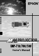 ■ ■ ■ ■ ■ ■ ■ ■ ■ ■ ■ ■ ■ ■ ■ 6 Technical Specifications General Type of display Poly-silicon TFT Size of liquid crystal panels 0.9 inches (22.9 mm) Resolution 1024 (horizontal) x 768 (vertical) pixels (EMP-710/700) 800 (horizontal) x 600 (vertical) pixels (EMP-500) Projection distance 26-300 inch (1.1-13.8 meters) Remote control range 32.8 feet (10 meters) Internal speaker system 1W Monaural Optical aspect ratio 4 : 3 (horizontal : vertical) Zoom ratio 1:1.