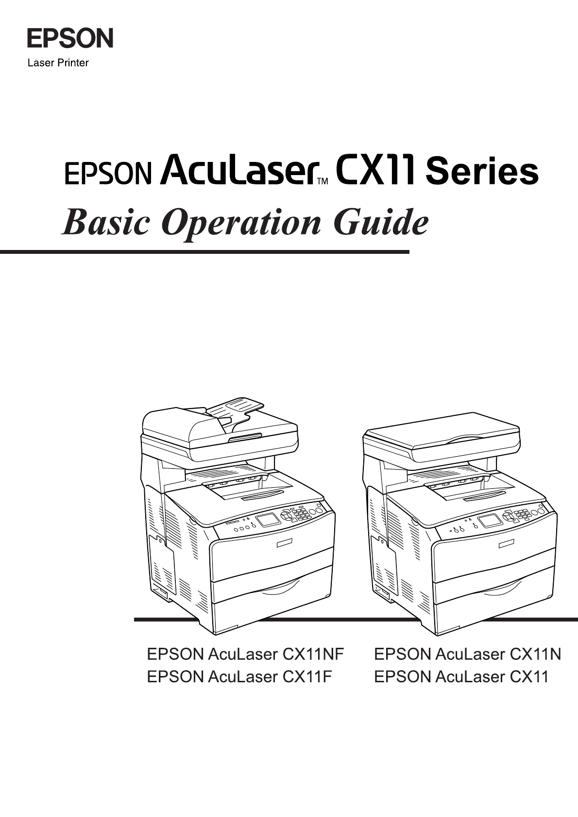 EPSON AcuLaser CX11 Series Basic Operation Guide Table of Contents Product Parts Front view . . . . . . . . . . . . . . . . . . . . . . . . . . . . . . . . . . . . . . . . . . . . . . . . . . . . . . . . . . . . . . . . . 3 Rear view . . . . . . . . . . . . . . . . . . . . . . . . . . . . . . . . . . . . . . . . . . . . . . . . . . . . . . . . . . . . . . . . . . 3 Inside the product . . . . . . . . . . . . . . . . . . . . . . . . . . . . . . . . . . . . . . . . . . . . . . . . . . . . . . . . . . .