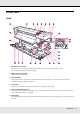 Printer Parts Front 1 Maintenance cover (left) Open this cover to clean the area around the print head. It is normally closed when the printer is in use. See “Cleaning Around the Print Head” on page 87. 2 Media output (eject) guide Media is output along this guide. 3 Roll core holder Place a used roll core for media take-up on these holders. There are two holders: one on the left and one on the right. See“Media Loading and Take-Up” on page 52.