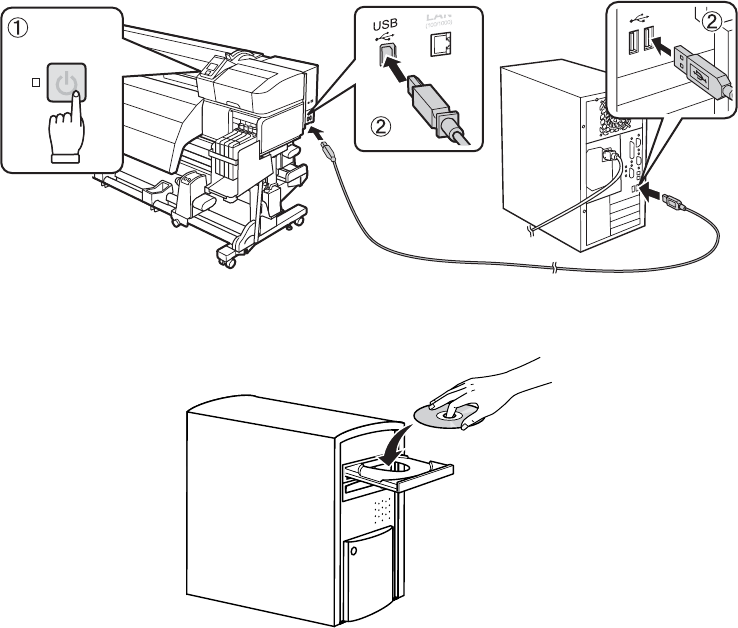 1. Press the P power button to turn off the printer, then connect the USB cable to the printer and your
