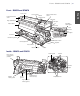 2 | Printer Parts Printer Parts Front - S30670 Front cover Control panel Media loading lever Left maintenance cover Right maintenance cover USB port LAN port After heater AC inlets Cartridge check lights Lock levers Ink cartridges Tensioner Waste ink tube Roll locking screw Waste ink tank Roll support Vent Adjuster Auto switch Manual switch Caster Inside - S30670 Flushing pad Print head in maintenance position Wiper Nozzle caps Wiper cleaner Media holding plate Platen heater Cutter groove