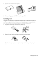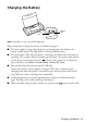 Charging the Battery Power light Battery light Note: The battery is not a user-replaceable part. Plug in the printer to charge the battery, as described on page 2. ■ The battery light is orange when the battery is charging and turns off when the battery is fully charged. The light flashes if a battery problem occurs. ■ The power light is blue when the printer is turned on and flashes when the printer is operating.