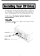 INSTALLATION INSTRUCTIONS 1 Unpack your ZIP Drive and accessories. ZIP Manual and Install Floppy Disks - External Power ZIP Drive 100MB ZIP Tools Disk 2 Turn off your computer’s power switch and pick up the ZIP data cable. 3 Connect one end of the cable to the ZIP connector on the back of your drive. B Always turn off computer power before connecting the ZIP Drive. (If the connector does not go on easily, try turning it over. Tighten all connector screws.