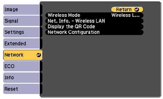 After you select the wireless network settings for your projector, you can display a QR code on the