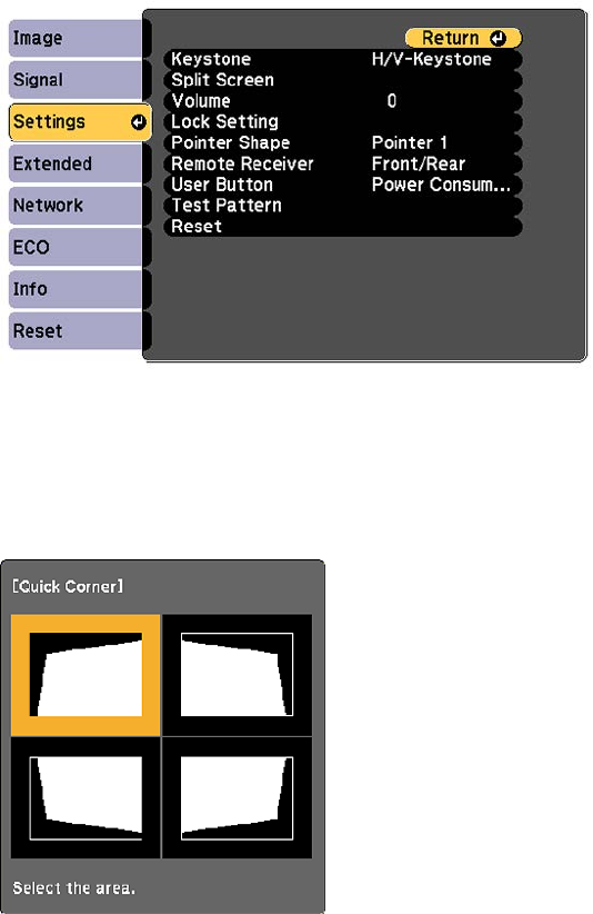 5. Select the Quick Corner setting and press Enter. Then press Enter again.