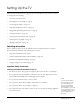 Setting Up the TV Follow the steps in these sections to prepare a spot for your TV, set it up, connect it, turn it on, and prepare it for viewing: • “Selecting a Location” below • “Installing the Set-Top Shelf ” on page 12 • “Connecting the Cables” on page 14 • “Preparing the Remote Control” on page 33 • “Plugging In and Turning On the TV” on page 35 • “Setting the Volume” on page 36 • “Selecting the Screen Display Size” on page 37 • “Selecting the Color Mode” on page 38 • “Turning Off the