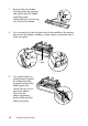 Labels To print on labels, you must use continuous paper loaded on the pull tractor. Keep the following tips in mind: ❏ Set the paper thickness lever to the correct position for labels. (See page 29.) ❏ Choose labels mounted on a continuous backing sheet with sprocket holes designed for tractor use. Do not print labels as single sheets, because the shiny backing causes the paper to slip slightly. ❏ Load labels the same way you load ordinary continuous paper. See page 20 for loading instructions.