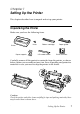 Chapter 1 Setting Up the Printer This chapter describes how to unpack and set up your printer. Unpacking the Printer Make sure you have the following items. Knob Ribbon cartridge Paper guide Printer Paper supports USB cable holder Printer software Carefully remove all the protective materials from the printer, as shown below, before you assemble or turn it on. Save all packing and protective materials in case you need to ship the printer in the future.