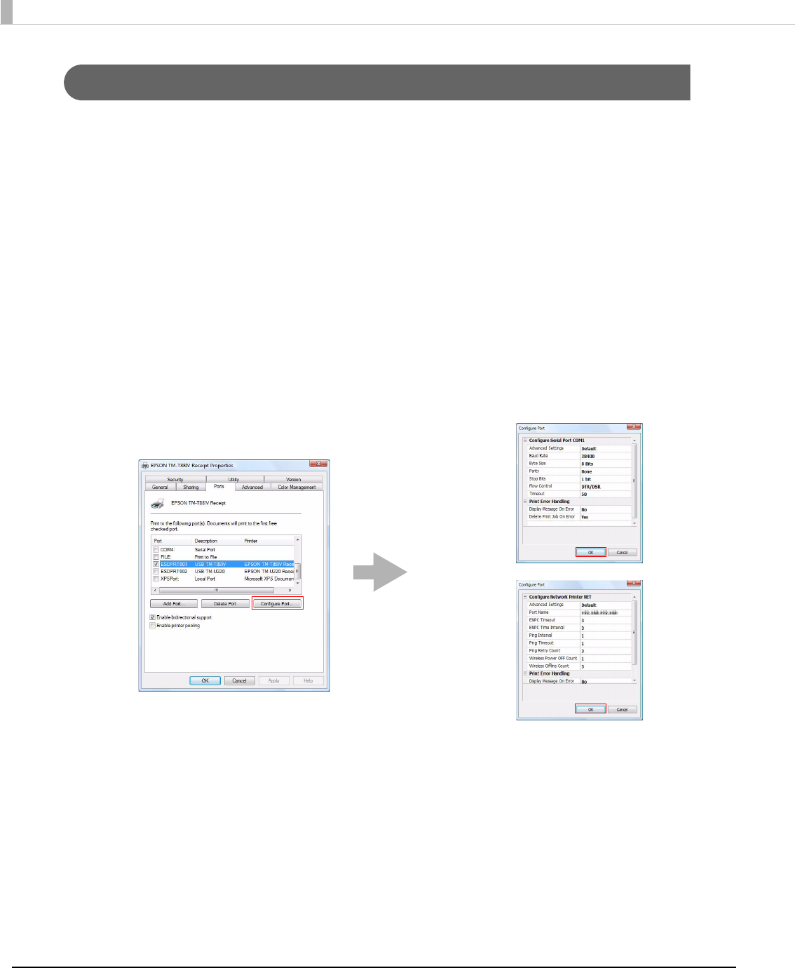 See the procedure below to change the port settings of the TM printer, such as changing serial