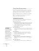 ■ If you’ve changed any settings for your projector or network, or you’ve restarted your computer, allow a minute or two for the connection to appear. If you’re using AirPort, you may have to turn AirPort off and then on again. ■ Make sure that you’re trying to connect to the right network. In Windows, verify that you’ve enabled your computer’s connection to the access point (see page 85) or that your wireless card or adapter is enabled and its SSID is set to match the projector’s ESSID (see page 75).