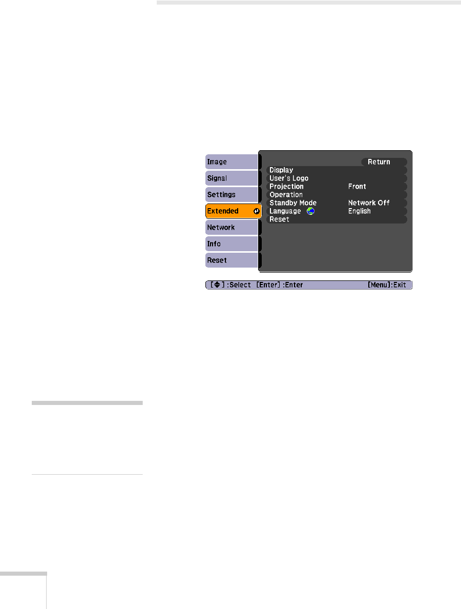 projection, change the language for the menus and messages, set the