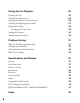 Caring for the Projector 25 Cleaning the Lens Cleaning the Projector Case Changing the Remote Control’s Battery Cleaning and Replacing the Air Filter Replacing the Lamp Resetting the Lamp Timer Storing the Projector Transporting the Projector 25 26 26 27 28 30 30 30 Problem Solving 31 What To Do When the Lights Flash Solving Picture Problems Solving Remote Control Problems Where To Get Help 31 32 36 36 Specifications and Notices 37 General Projection Lamp Remote Control Dimensions Electrical En