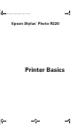 R220.book Page 5 Sunday, August 7, 2005 3:41 PM Welcome Your Epson Stylus® Photo R220 is a full-featured photo and CD/DVD printer. You get outstanding prints from these advanced features: ■ Epson’s exclusive 6-color ink technology lets you achieve fine shadow detail, dazzling highlights, and excellent fill across a wide range of colors. Genuine Epson® ink and papers create long-lasting and water-resistant prints. ■ CD and DVD printing on ink jet-printable CDs and DVDs.
