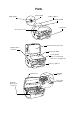Parts edge guide sheet feeder paper support feeder guard output tray document cover reflective document mat transportation lock lever document table control panel (See “Control Panel Functions” on page 12.