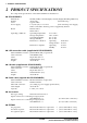2 PRODUCT SPECIFICATIONS 2 PRODUCT SPECIFICATIONS The components specifications of the S5U1C6S3N2E2 are listed below. ■ S5U1C6S3N2E2 Dimensions: Weight: Color: Power supply: Board: Operating conditions: 203 mm (width) × 275 mm (depth) × 65 mm (height) (Including rubber feet) About 2 kg (main unit only) Cygnus white 5 V (±10%) DC, 3 A or more (from external power supply) When connected to the ICE, power is supplied by the ICE.