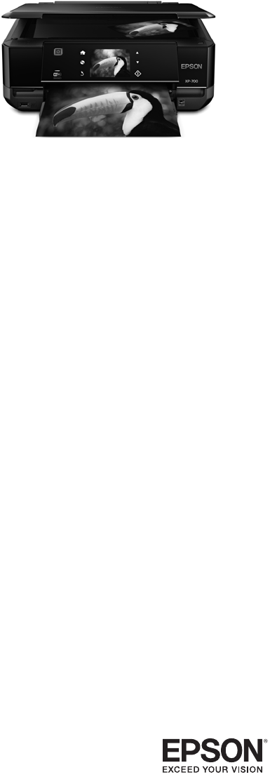 About Your Product After you set up your XP-700 (see the Start Here sheet), turn to this Quick Guide and your online User’s Guide for instructions on using your product. Features Where to find information Copy and scan from the easy-to-use touch screen. See this Quick Guide for the basics. See the online User’s Guide for details. Easy networking—WiFi, Wi-Fi Direct, and Ethernet®. See the Start Here sheet and the online User’s Guide.