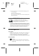Proof Sign-off: M.Hida, CRE Tsukada_______ N. Nomoto _______ _______ R4C260 short.bk Rev_C A5 size 12/15/99 SAFE.FM Pass 3 R When handling the ink cartridges ❏ Keep ink cartridges out of the reach of children. Do not allow children to drink from or otherwise handle the cartridges. ❏ If ink gets on your skin, wash it off with soap and water. If it gets in your eyes, flush them immediately with water. ❏ Do not shake an ink cartridge; this can cause leakage.