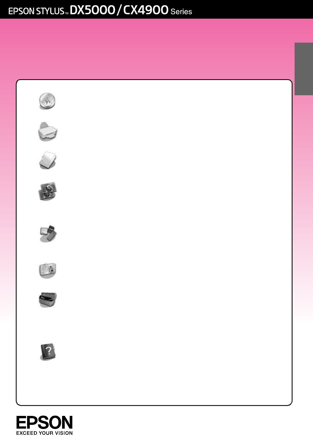 Purchasing ink cartridges Product name Black Cyan Yellow Magenta DX5000 series T0711 T0712 T0714 T0713 CX4900 series T0731 T0732 T0734 T0733
