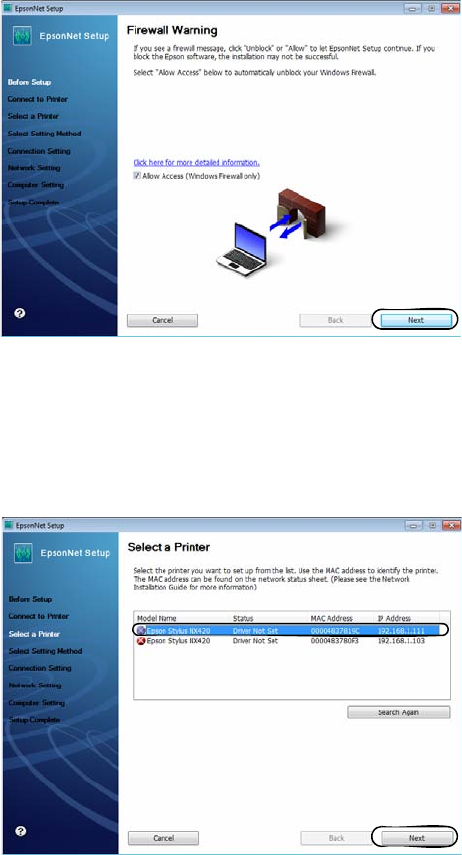 If you see a firewall alert message, click Unblock or Allow to let EpsonNet Setup
