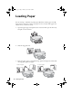 spr280_qg.book Page 4 Monday, June 4, 2007 2:20 PM Loading Paper You can load up to 120 sheets of plain paper, 100 sheets of matte paper, and 20 sheets of most other photo papers (see page 5 for a list). Load transfer paper and adhesive sheets one sheet at a time. 1. Open the paper support and pull out the extension. Then open the front tray and pull out the extensions. 4 5 2. Slide the edge guide left. 3. Insert the paper, glossy or printable side up, against the right side.
