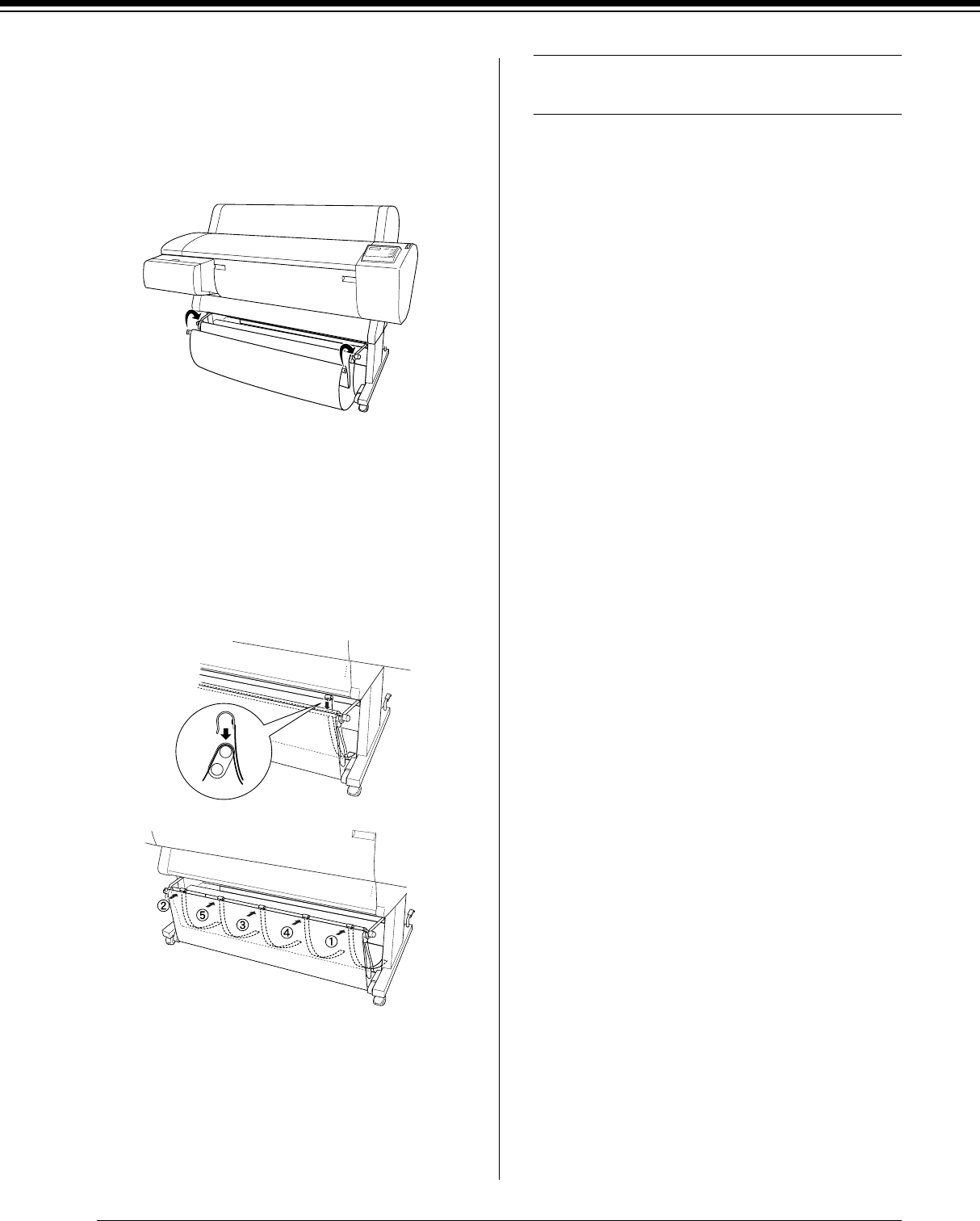 - 1. Steek de haken van de papieropvang in de sleuven van de draaikoppen op de onderste horizontale steunbalk. Zorg ervoor dat de bovenzijden van de haken naar beneden wijzen.