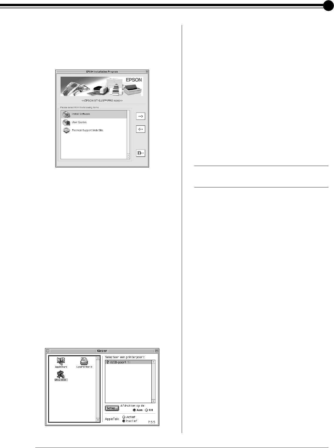 - 2. Schakel uw Macintosh in en plaats de cd-rom met de printersoftware die bij de printer is geleverd in de cd-rom-lezer. De cd-rom met EPSON printersoftware wordt automatisch geopend.