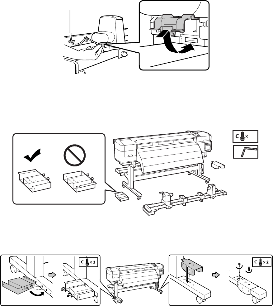Attach the brackets to the front of the printer using two C screws on each side as shown.