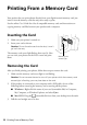 Printing From a Memory Card Your product lets you print photos directly from your digital camera’s memory card; just insert it into the memory card slot and you’re ready to print. See the online User’s Guide for a list of compatible memory cards and instructions on copying memory card files between your product and a computer. Inserting the Card 1. Make sure your printer is turned on. 2. Insert your card as shown. Caution: Do not force the card into the slot; it won’t go in all the way.