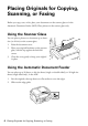 Placing Originals for Copying, Scanning, or Faxing Before you copy, scan, or fax, place your documents on the scanner glass or in the Automatic Document Feeder (ADF). Place photos on the scanner glass only. Using the Scanner Glass You can place a photo or a document up to lettersize (or A4-size) on the scanner glass. 1. Raise the document cover. 2. Place your original facedown on the scanner glass, with the top against the back left corner. 3. Close the cover gently to keep your original in place.