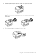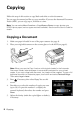 Copying Follow the steps in this section to copy black-and-white or color documents. You can copy documents just like on a copy machine. If you use the Automatic Document Feeder (ADF), you can copy up to 30 sheets at a time. Note: You can select More Functions > Copy/Restore Photos to copy photos onto EPSON photo paper (various types and sizes available). See the online User’s Guide for details. Copying a Document 1. Make sure paper is loaded in one of the paper cassettes (see page 4). 2.