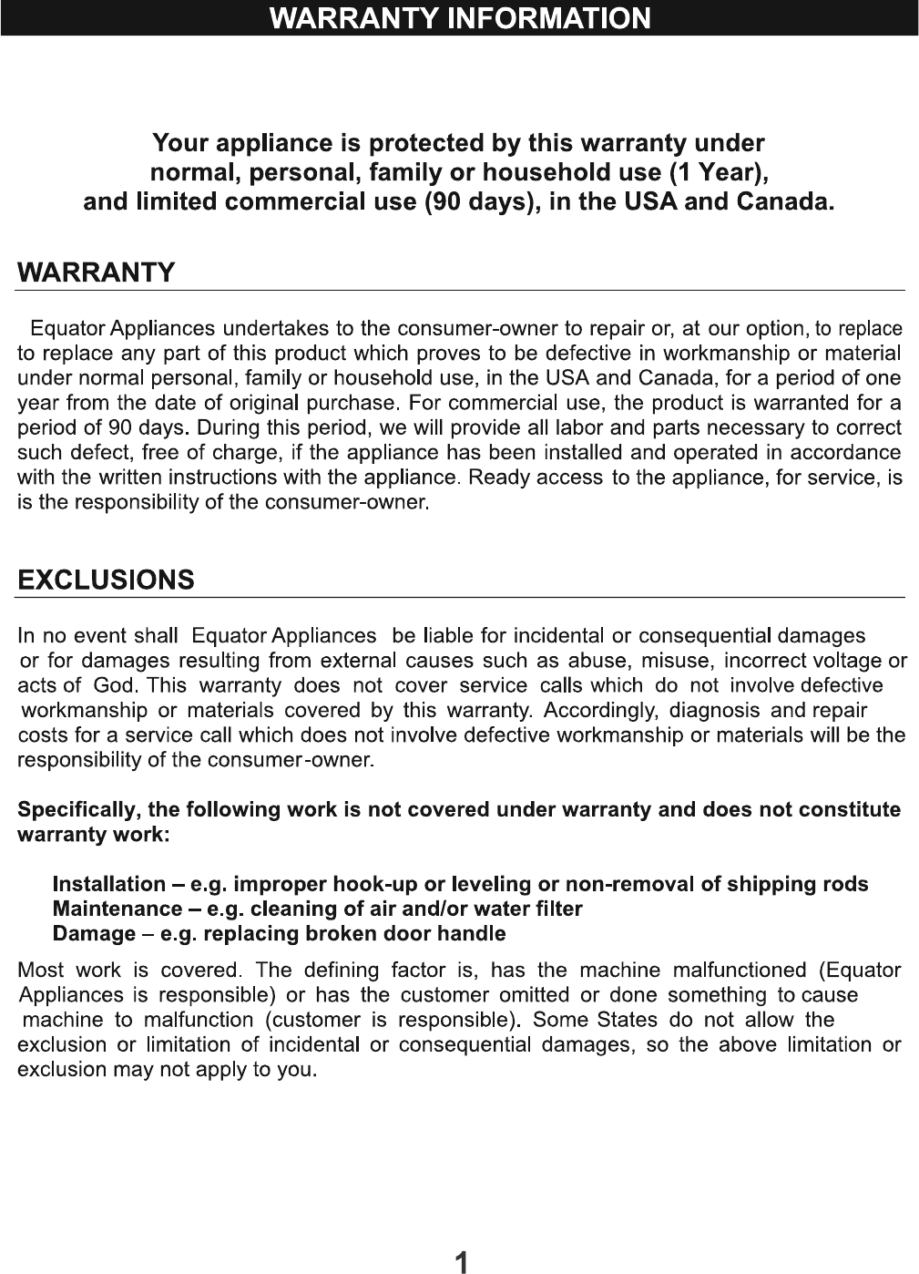 WARRANTY INFORMATION Your appliance is protected by this warranty under normal, personal, family or household use (1 Year), and limited commercial use (80 days), in the USA and Canada. WARRANTY Equator Appliances undertakes o the consumer-owner to repair or, at our option, to replace to replace any part of this product which proves to be defective in workmanship or material under normal personal, family or household use, in the USA and Canada, for a period of one year from the date of original purchase.