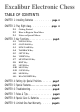Excalibur Electronic Chess TABLE OF CONTENTS CHAPTER 1: Installing Batteries . . . . . . . . page 4 CHAPTER 2: Play Right Away. . . . . . . . . . page 2.1 2.2 2.3 CHAPTER 3: Key Functions. . . . . . . . . . . . . . . . 3.1 3.2 3.3 3.4 3.5 3.6 3.7 3.8 3.9 3.10 3.11 3.12 3.