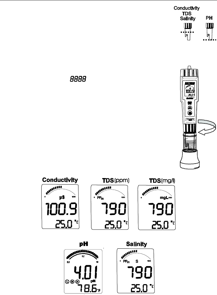5. If in the Conductivity, TDS or Salinity modes, the meter will auto-range to