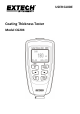 Introduction Congratulations on your purchase of the Extech CG204 Coating Thickness Tester. The CG204 is a portable meter designed for non‐invasive coating thickness measurements. The meter uses two measurement methods: magnetic induction (for ferrous metal substrates) and eddy current (for non‐ferrous metal substrates). Proper use and care of this meter will provide many years of reliable service. Description Meter Description 1. USB jack for PC interface 2. Measurement probe 3. Backlit LCD display 4.