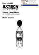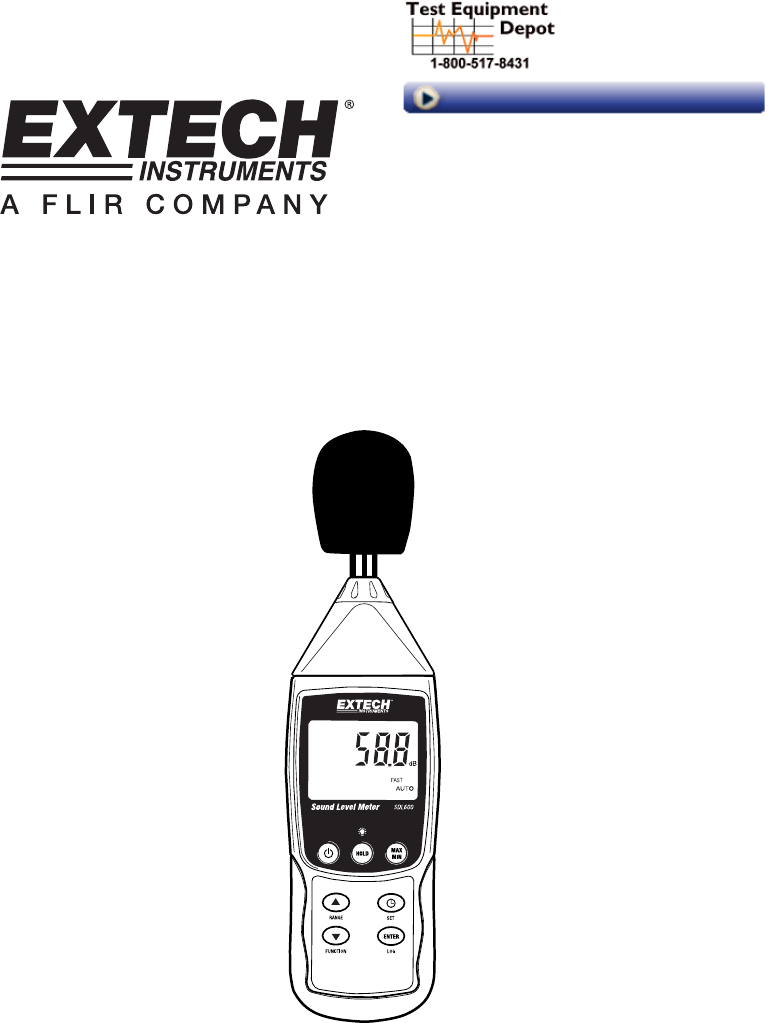 Introduction Congratulations on your purchase of the Extech SDL600 Sound Level Meter. This meter displays and stores sound level readings in the 30 to 130 db range. The SDL600meets ANSI and IEC 61672 class 2 standards and includes ‘A’ and ‘C’ frequency weighting and FAST and SLOW response time. Logged data readings are stored on an SD card for transfer to a PC. This meter is shipped fully tested and calibrated and, with proper use, will provide years of reliable service.